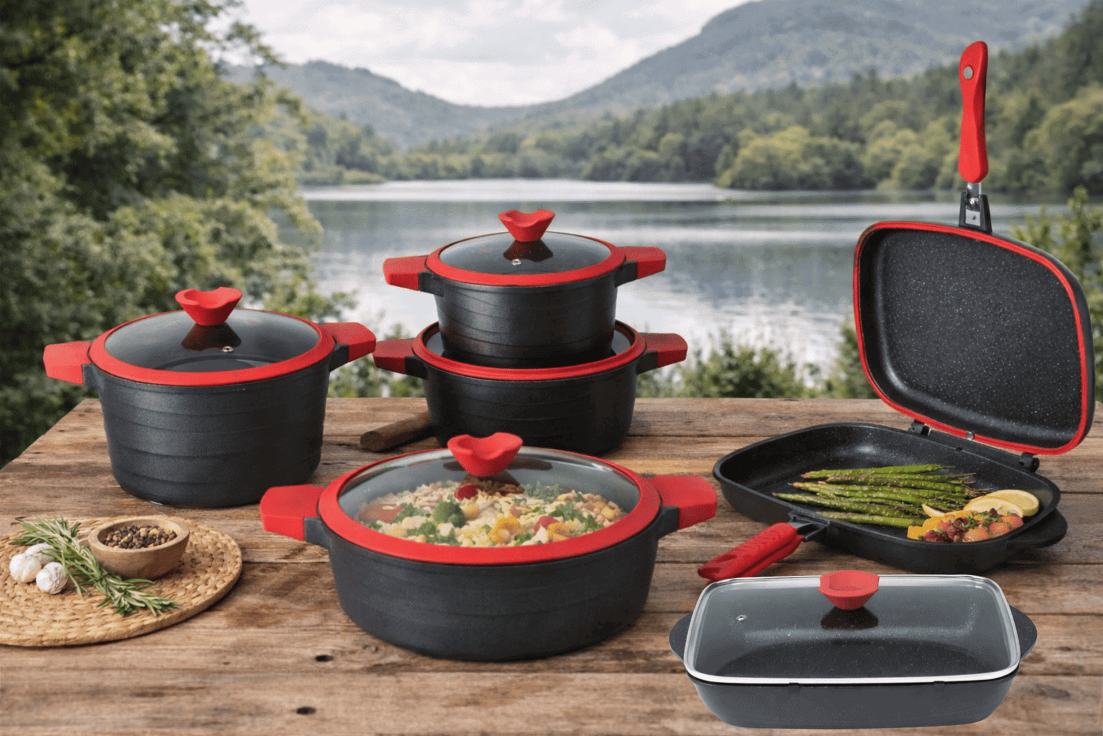 Comprehensive Set: A large 14-piece set that provides multiple pot sizes, matching tempered glass lids, and often a frying pan or grill pan, catering to all your culinary needs.Â
