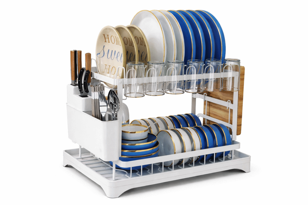 This versatile 2-tier dish rack is a comprehensive solution for organizing essential kitchenware in one compact footprint. The heavy-duty metal frame is built for stability and can support substantial weight, often up to 23 kg to 30 kg. Its high-capacity design can typically accommodate approximately 10–18 bowls and 11–16 plates, while specialized side attachments keep utensils, mugs, and cutting boards neatly separated for efficient air drying.