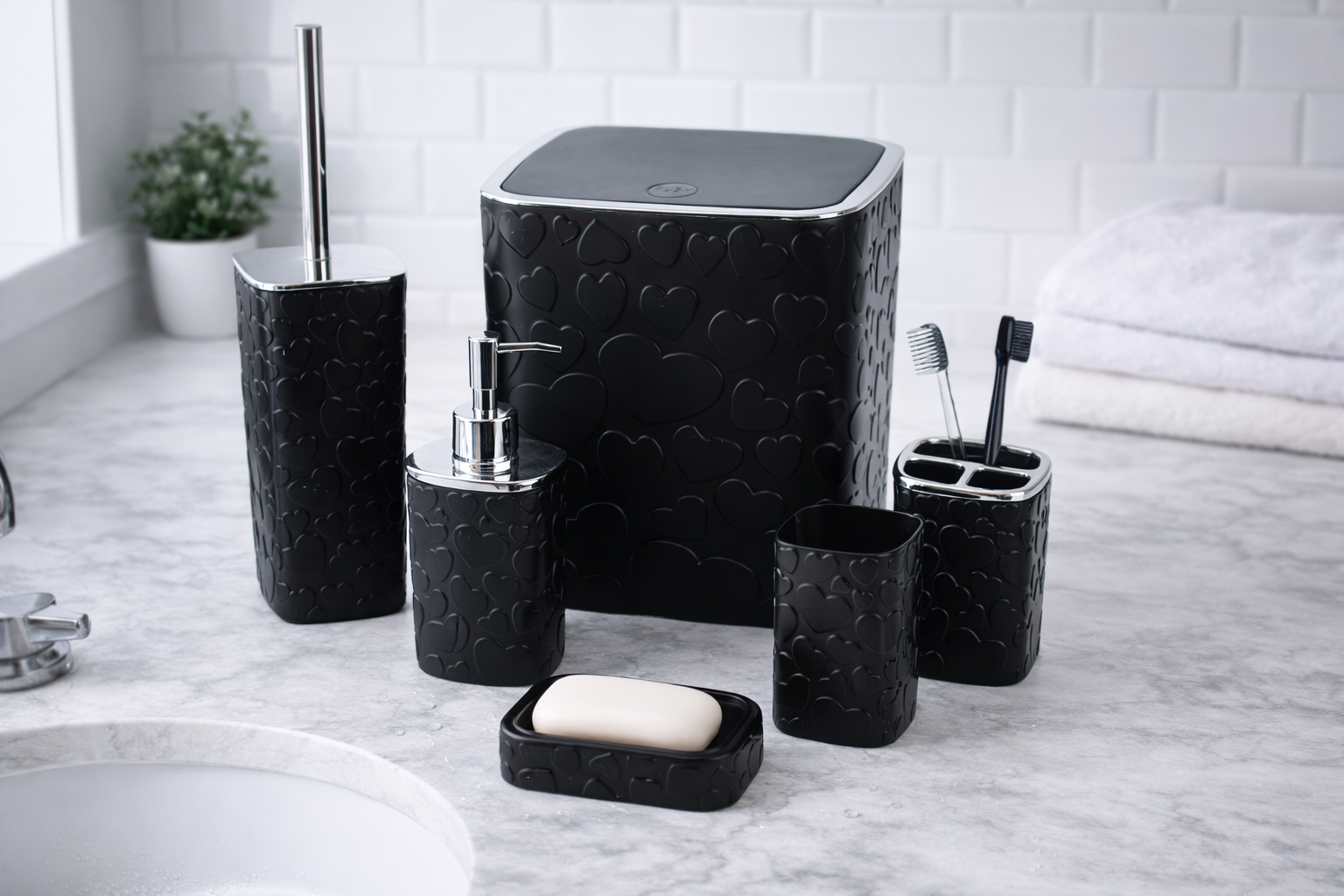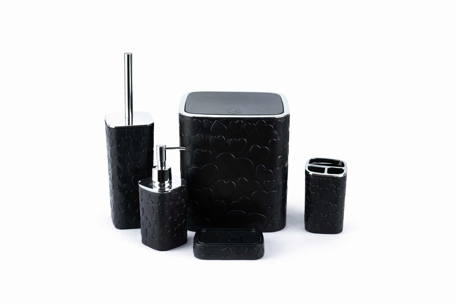 This sophisticated 6-piece set is crafted from durable, high-quality materials and finished in a chic matte black. The unique, subtle glossy heart pattern adds a playful yet elegant texture, making this ensemble a standout addition to any contemporary decor.