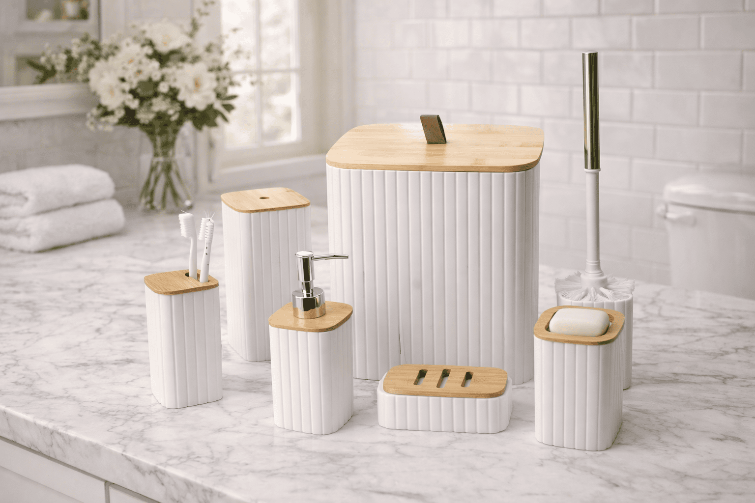 - Eco-Conscious Accents: Natural bamboo wood tops and features add a touch of organic warmth, complementing the white finish.