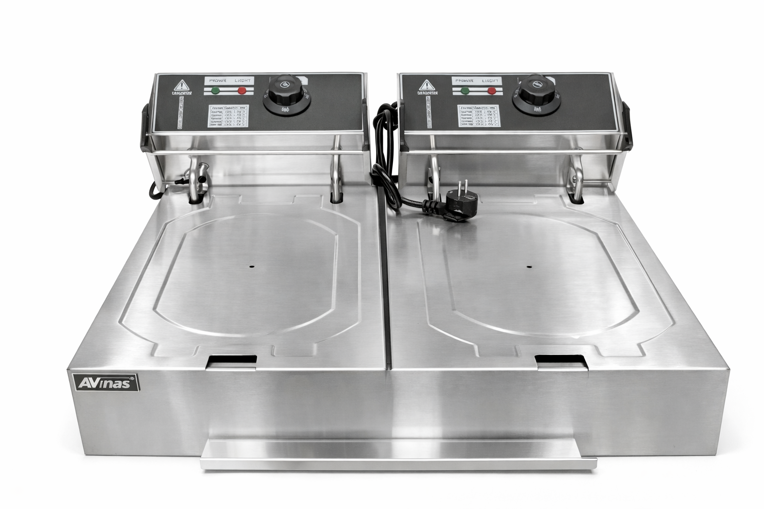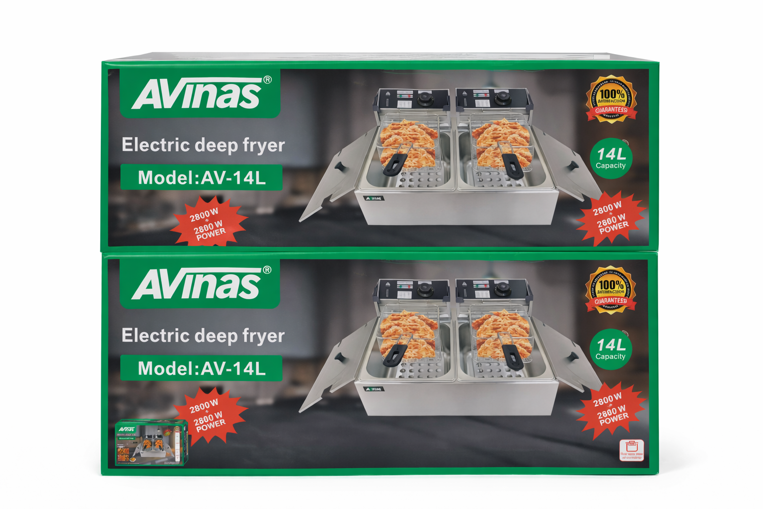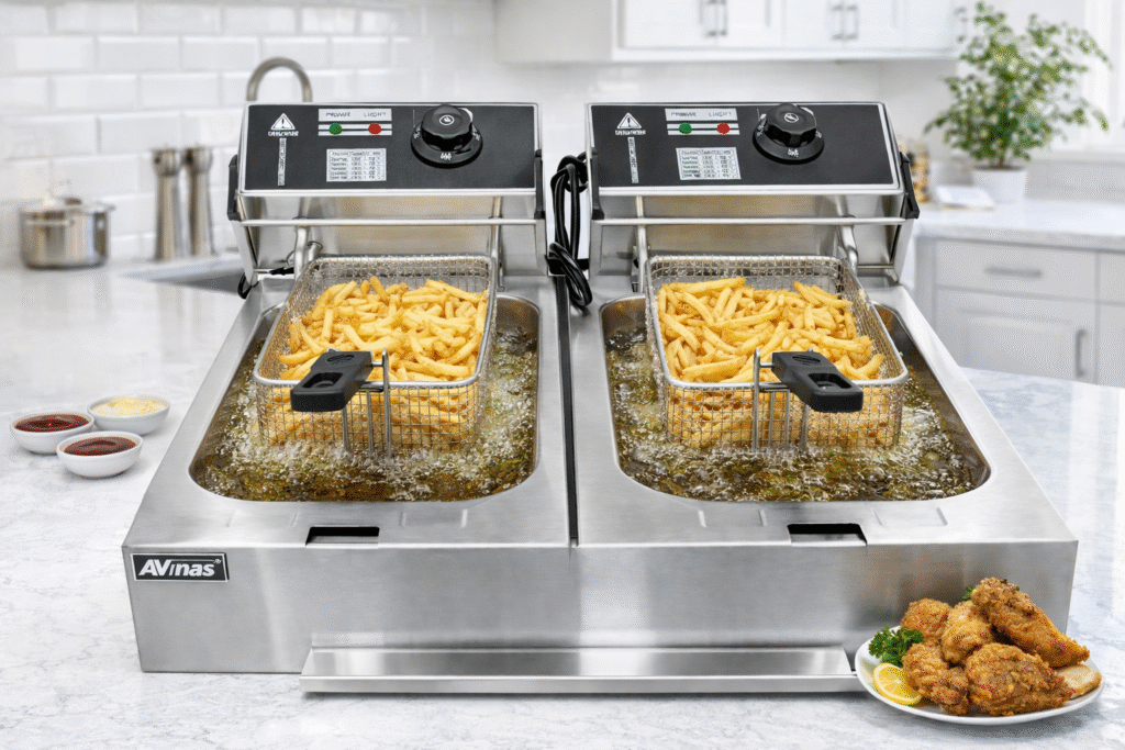 The AVinas Electric Deep Fryer is a commercial-grade, high-capacity appliance designed for frying large quantities of food efficiently. It features a dual-tank system with separate heating elements and baskets, making it ideal for high-traffic environments like restaurants or large family gatherings