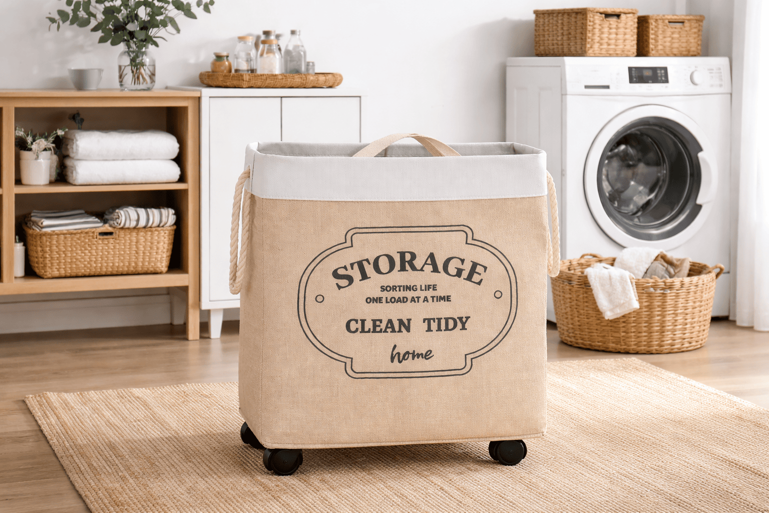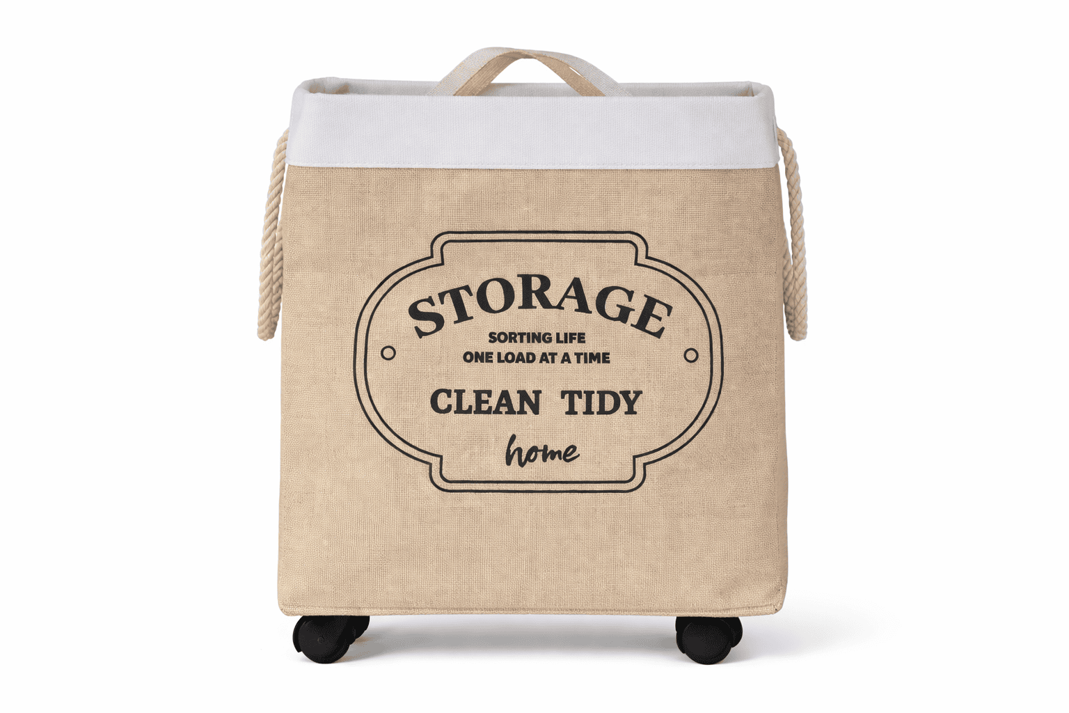 This laundry hamper is a practical, space-saving solution typically constructed from durable, heavy-duty canvas or a rugged jute-cotton blend. The bag is designed to be collapsible, allowing it to be folded flat when not in use to save space in bedrooms or bathrooms. A key feature is the set of movable wheels (casters) at the base, which allow for effortless transportation of large laundry loads without heavy lifting.