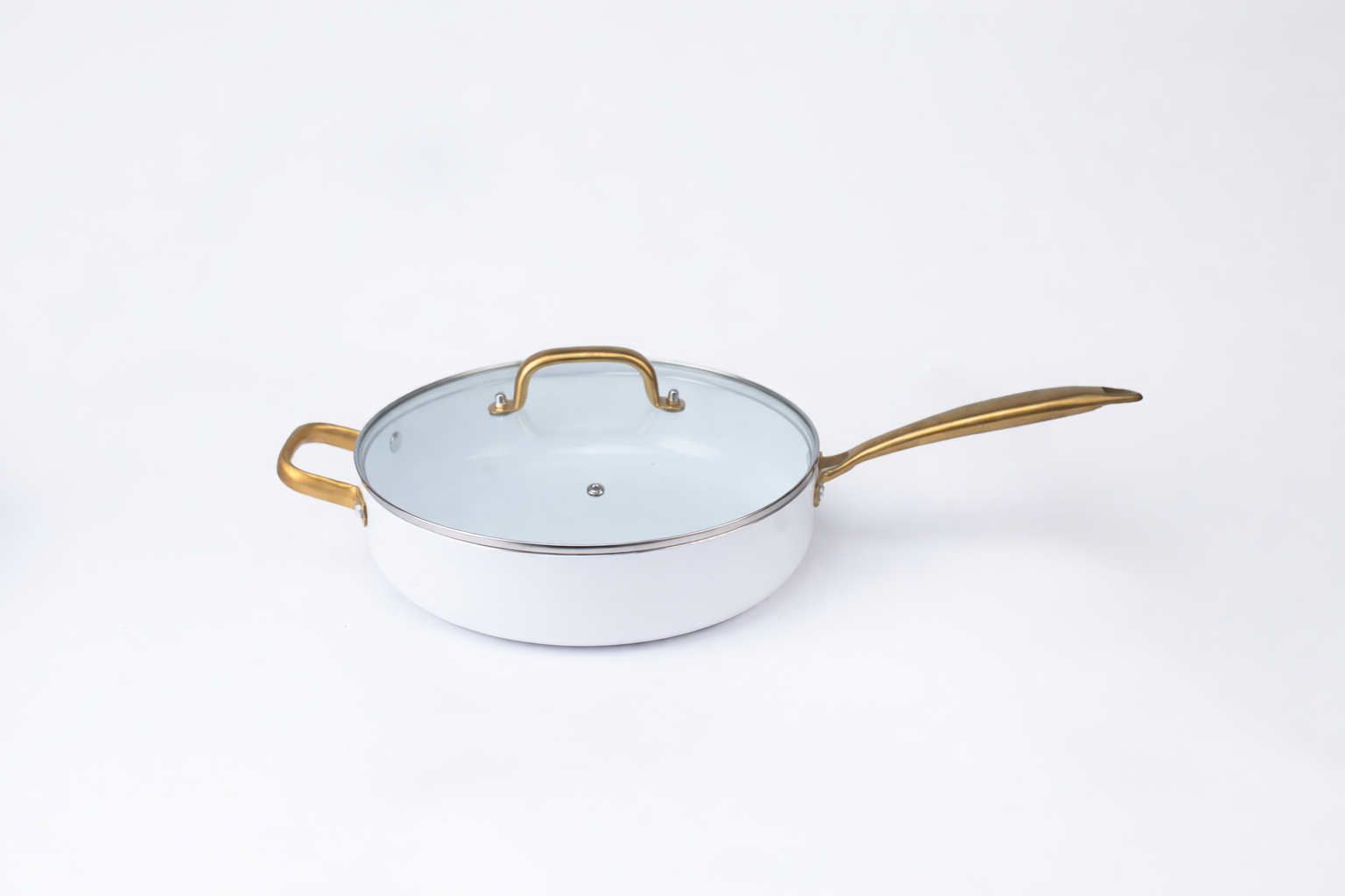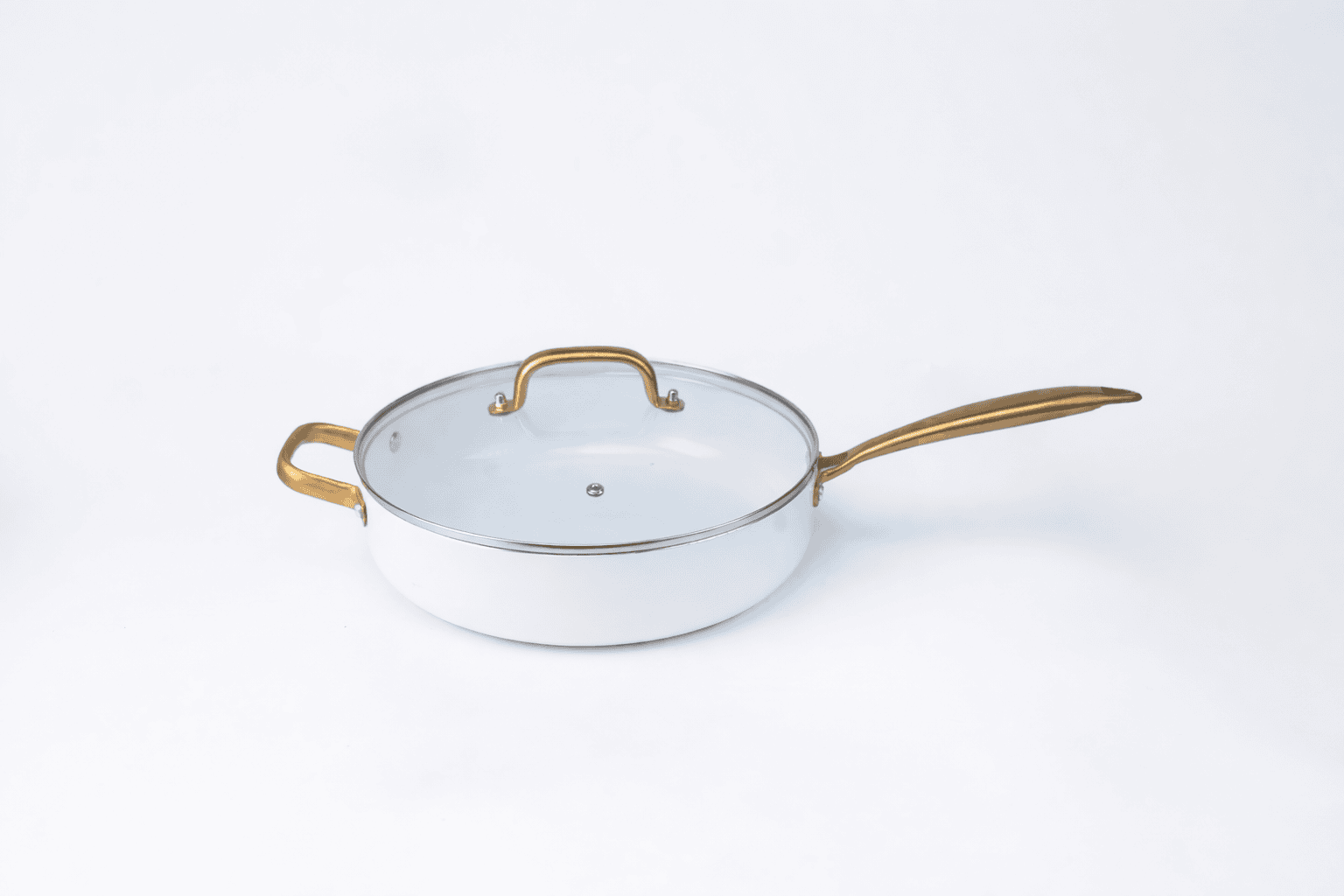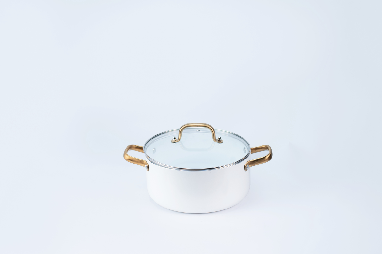 | Color/Finish | Matte White Exterior Handles, Stainless Steel Brushed Gold Lids, Tempered Glass Clear with Gold Handles |