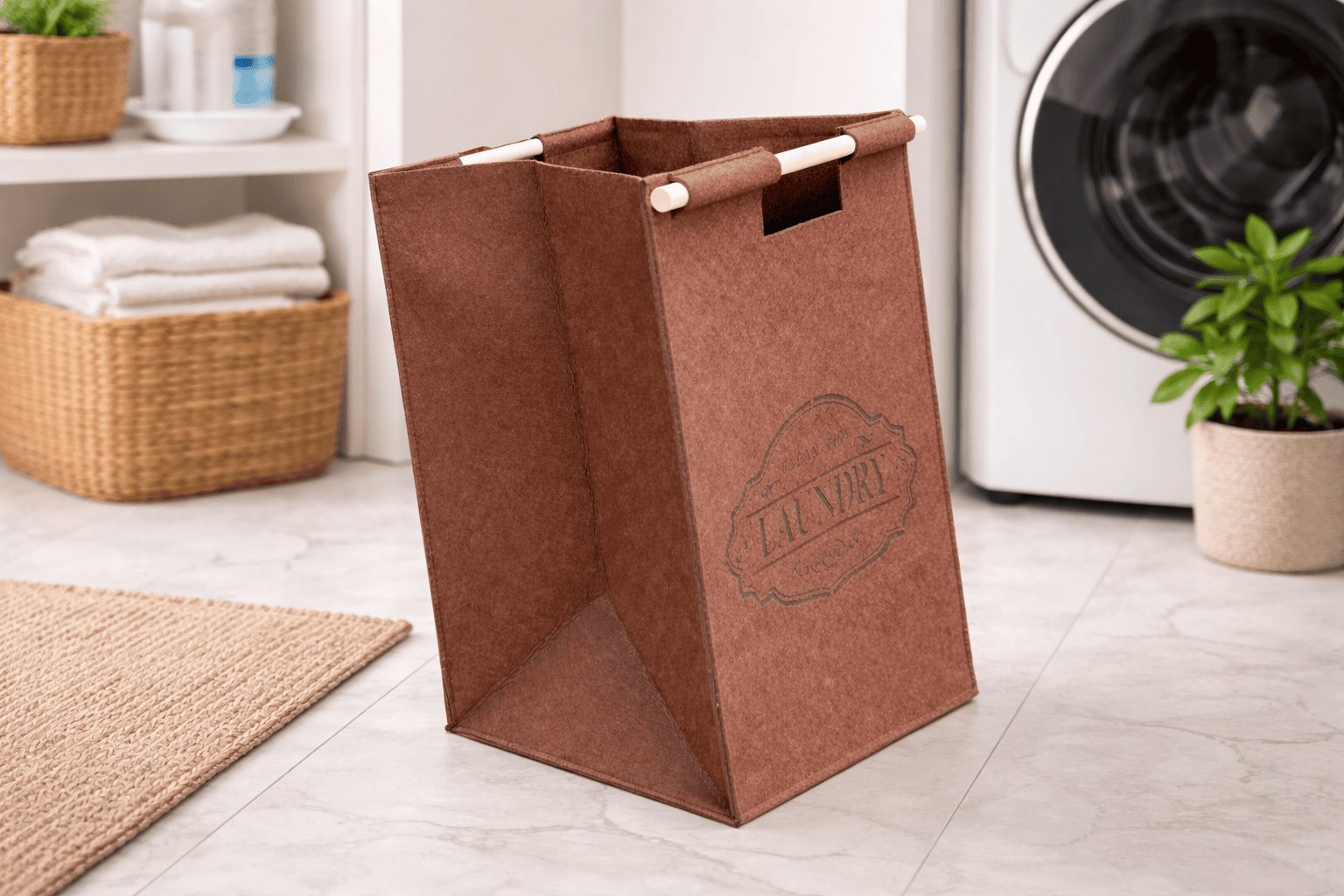 This brown felt laundry hamper is a versatile and aesthetic home organization solution. Unlike traditional plastic bins, it is crafted from a high-density, tear-resistant fabric that maintains its shape while remaining soft enough to prevent snags on delicate clothing. The integrated wooden handles provide a sturdy grip, making it easy to carry even when full.