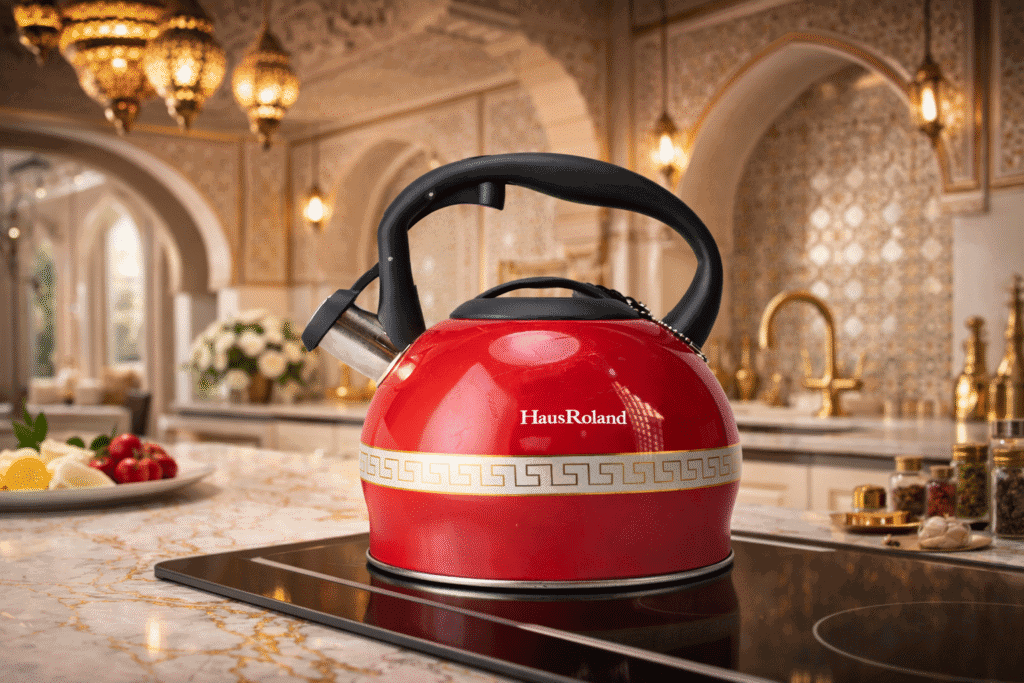The Haus Roland kettle is crafted from high-quality, food-grade stainless steel with a vibrant coloured finish. Its modern design suits any kitchen aesthetic and is compatible with induction, gas, and electric stovetops.