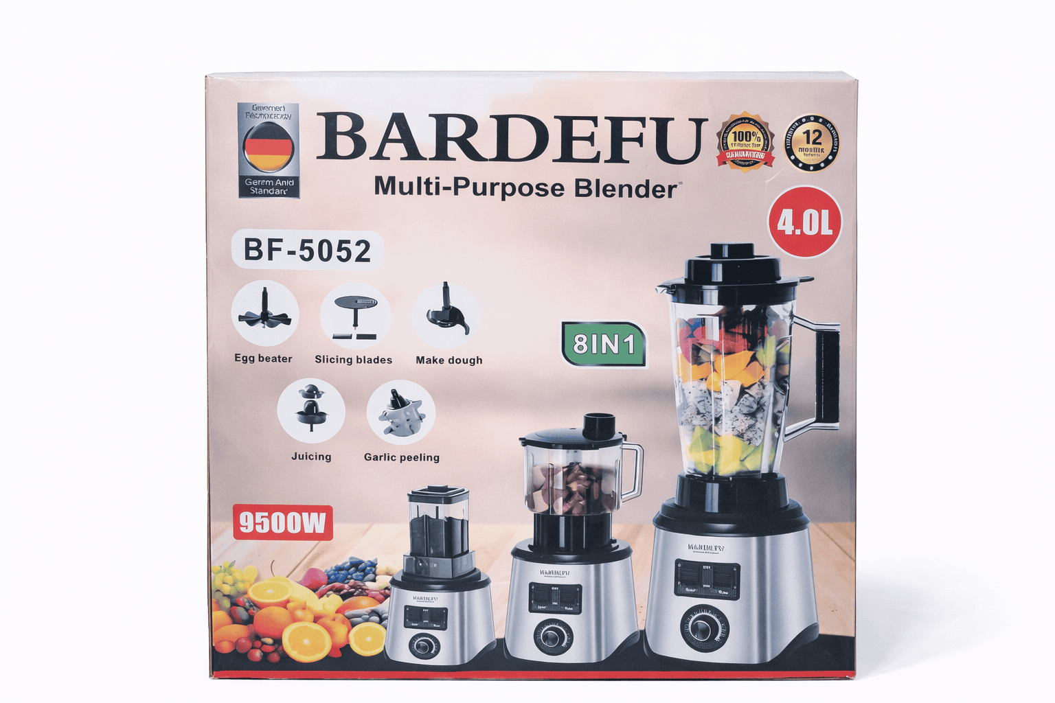 8-in-1 Versatility: Performs multiple functions, including juicing, egg beating, slicing, dough making, garlic peeling, grinding, and ice crushing.