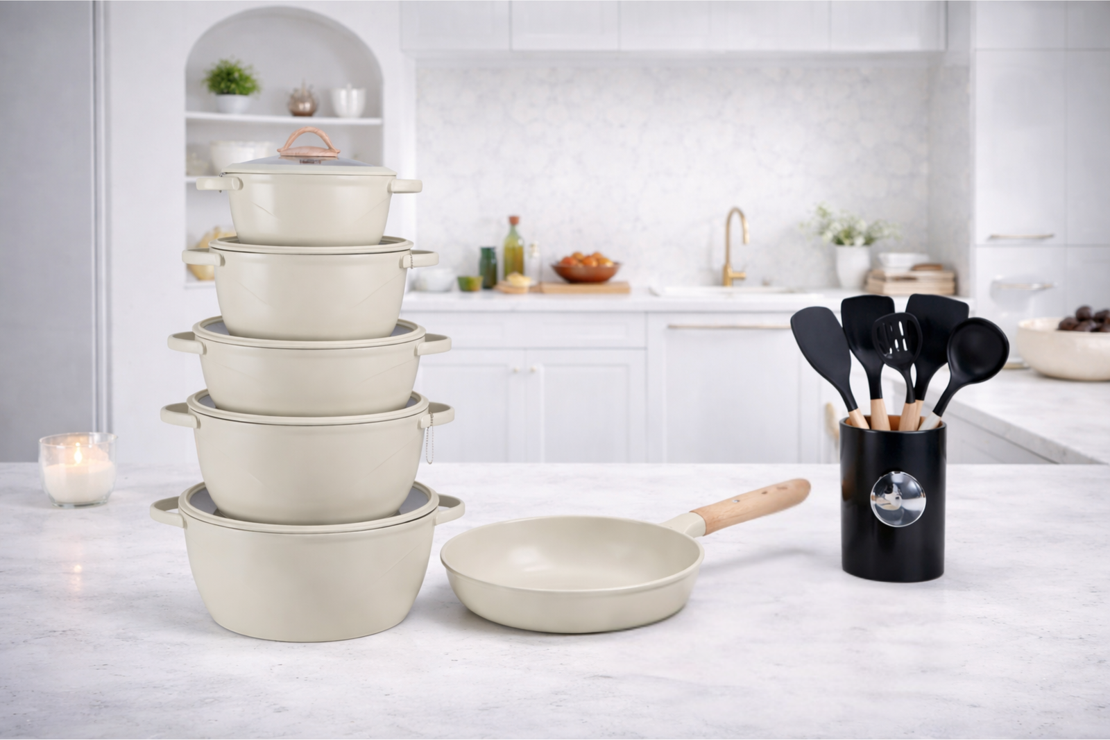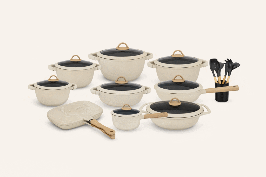 | Capacity/Size | 10pcs Silicone Protecter, 18cm Sauce Pan, 20cm Casserole, 24cm Casserole, 28 shallow casserole, 28cm casserole, 30cm Wok, 32cm Casserole, 32cm Fish Pot, 36cm Double Sided Baking Tray, 7pcs Kitchen Tools |