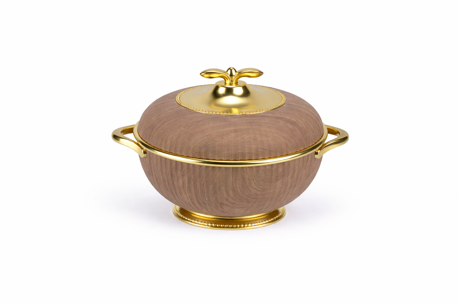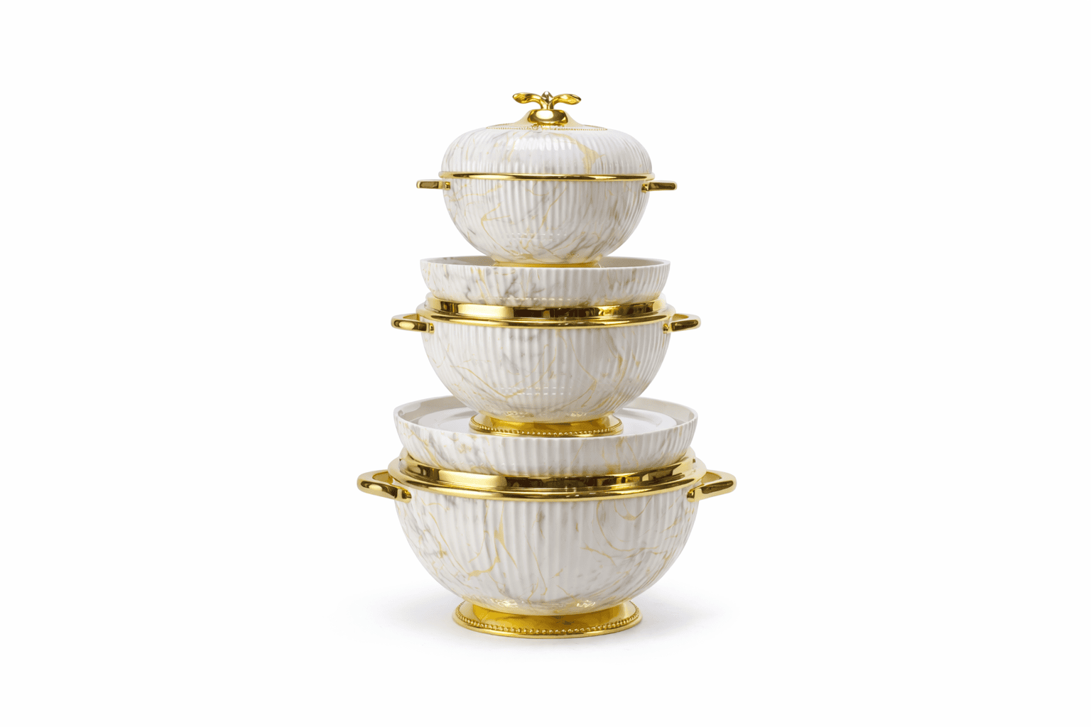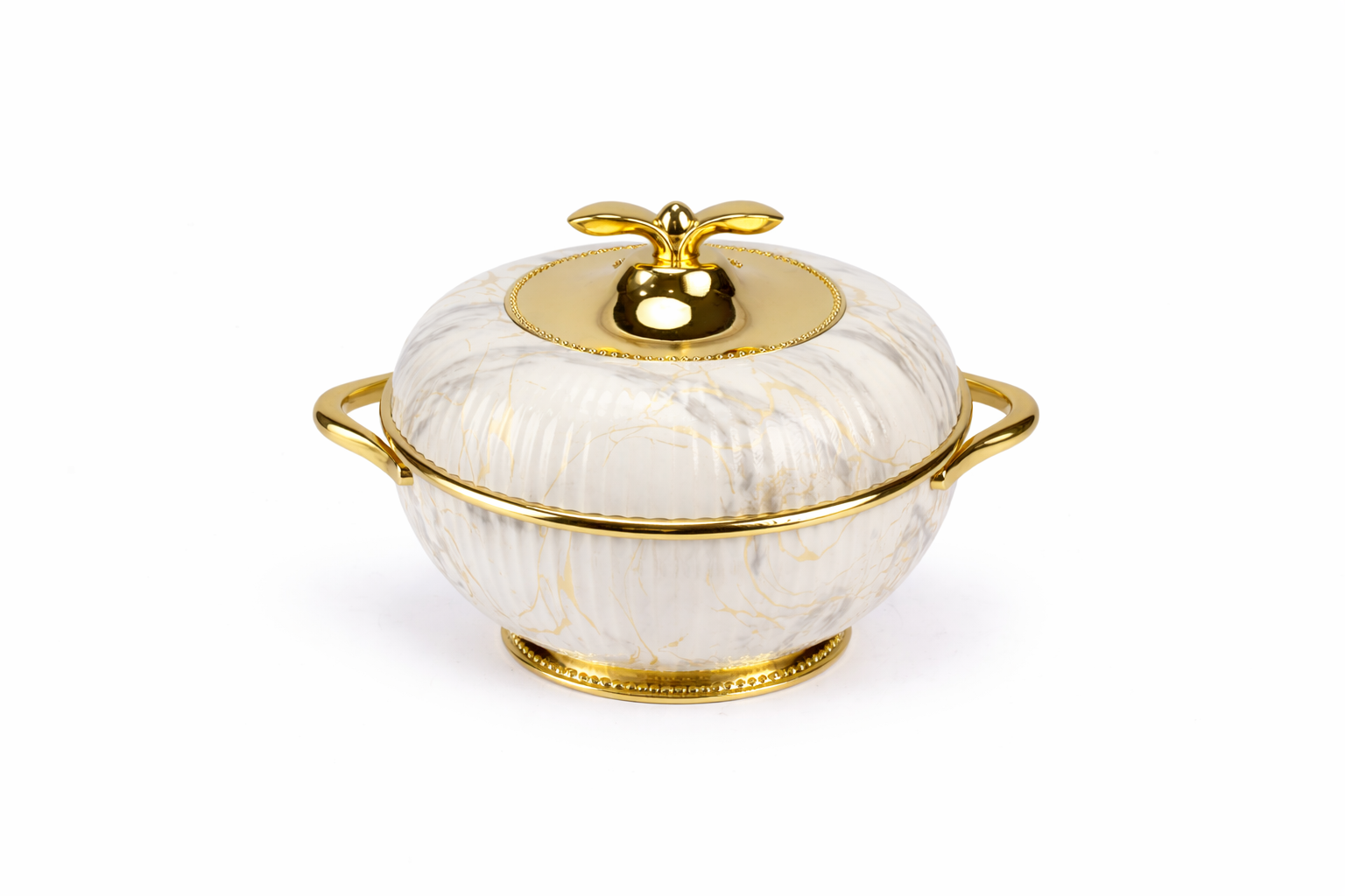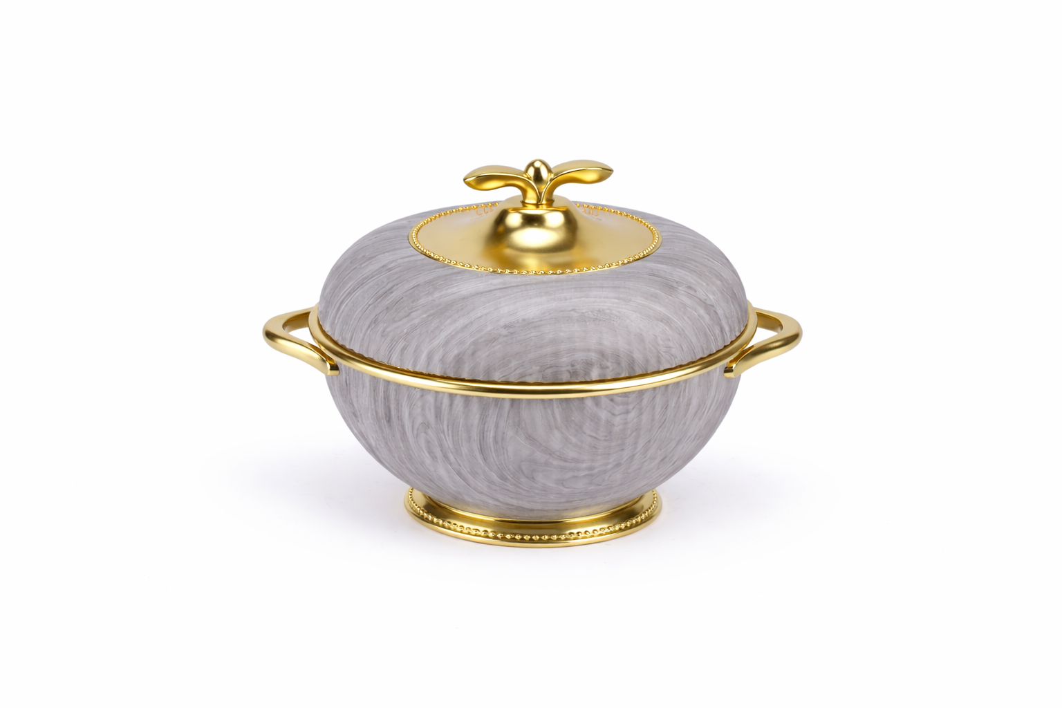- Gilded Details: Luxurious gold-toned handles, base, and lid finial provide a striking contrast, making a statement piece that demands attention.