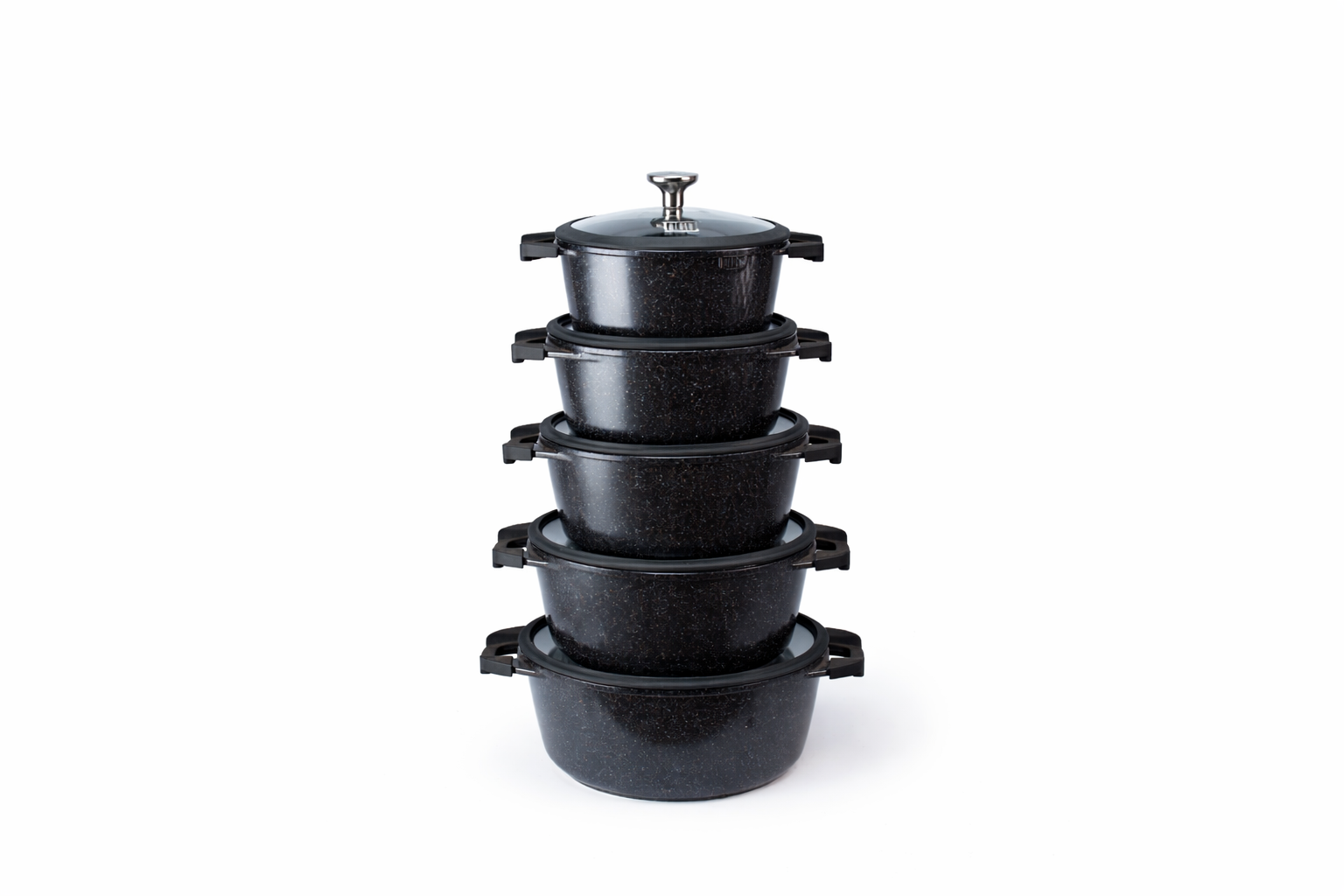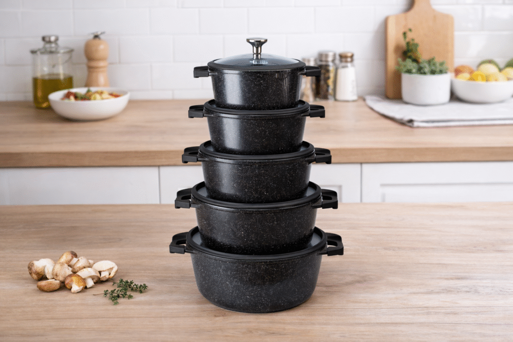 • Space-Saving Design: The unique, stable stack configuration allows all pots and pans to fit neatly within one another, freeing up valuable cabinet and drawer space.