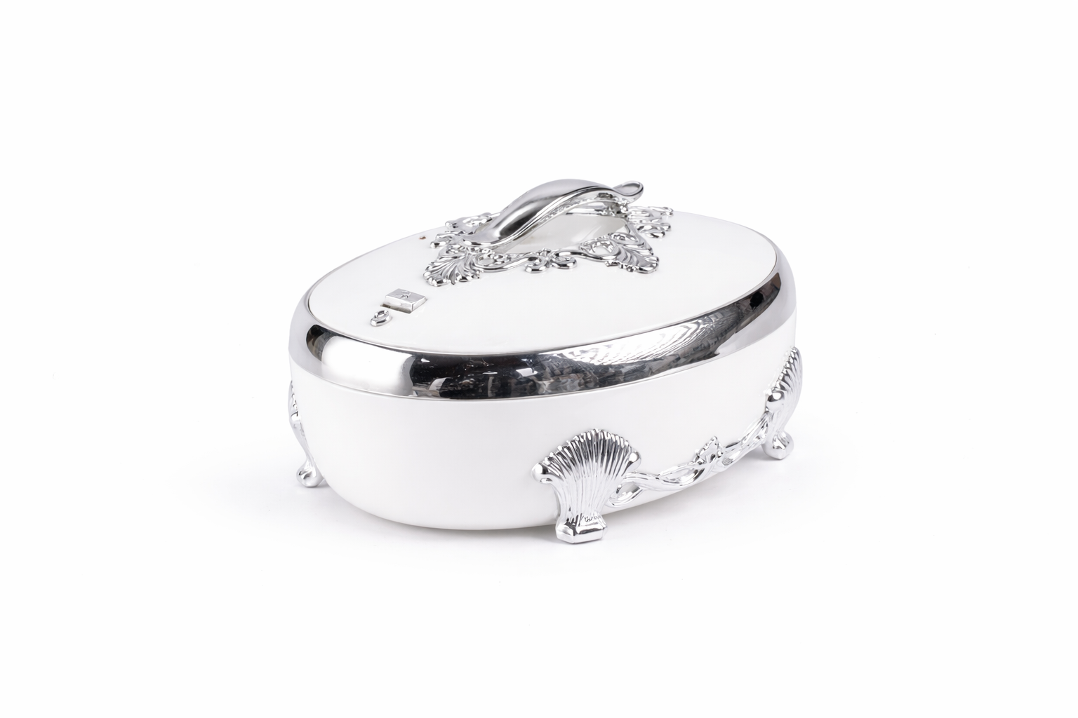 - Polished Silver Accents: Intricate, polished silver detailing, including the handles, base, and ornate shell motifs, adds a touch of luxury and prestige.